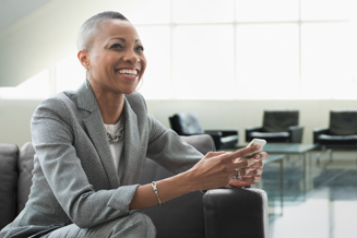 Black businesswoman using cell phone on sofa in office